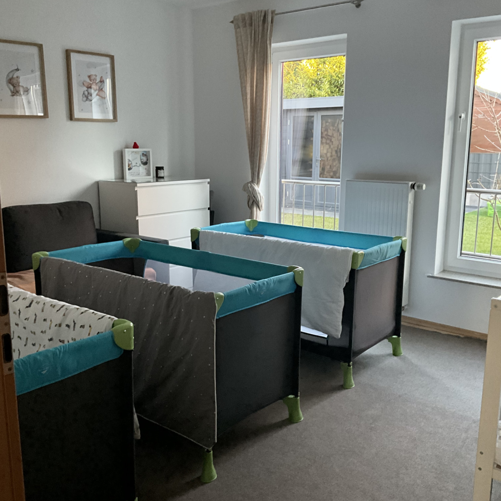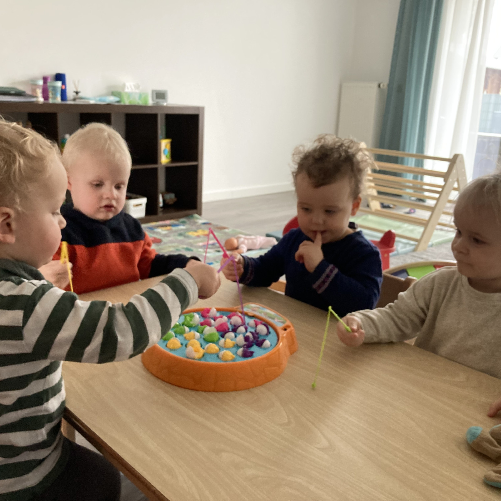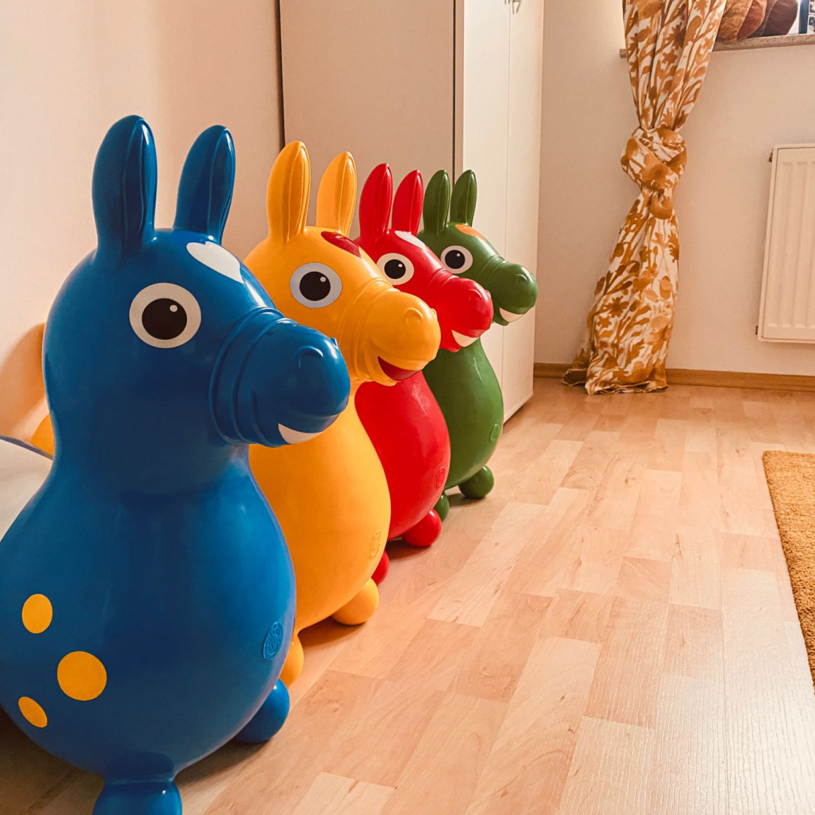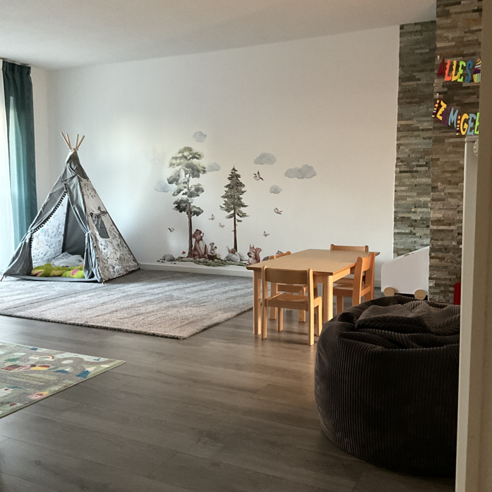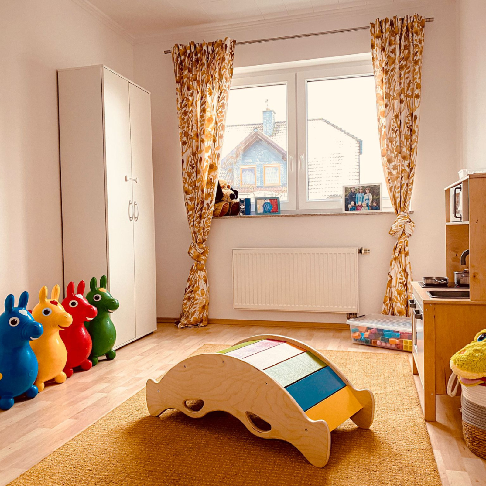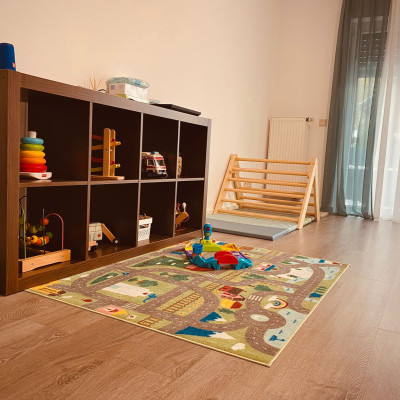 Im großen Spielraum haben die Kinder ausgiebig Platz zum Toben, Spielen und Kuscheln. Dort befindet sich ebenso unser Esstisch, an welchem wir täglich gemeinsam essen. Nebenan liegt der kleinere Spielraum, in welchem die Kinder außerdem die Möglichkeit haben, mit der Spielküche zu spielen, auf den Hüpfpferdchen zu springen oder mit den Bauklötzen Türme zu bauen.
