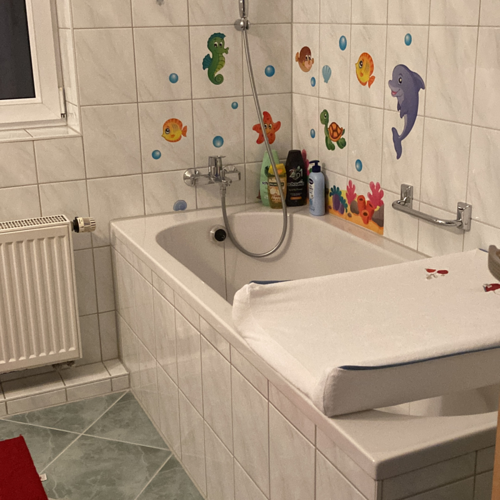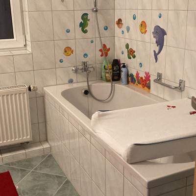 Nach einem Spaziergang, oder dem Spielen im Garten, waschen wir gemeinsam unsere Hände im Badezimmer. Dort werden die Kinder auch gewickelt und gepflegt.